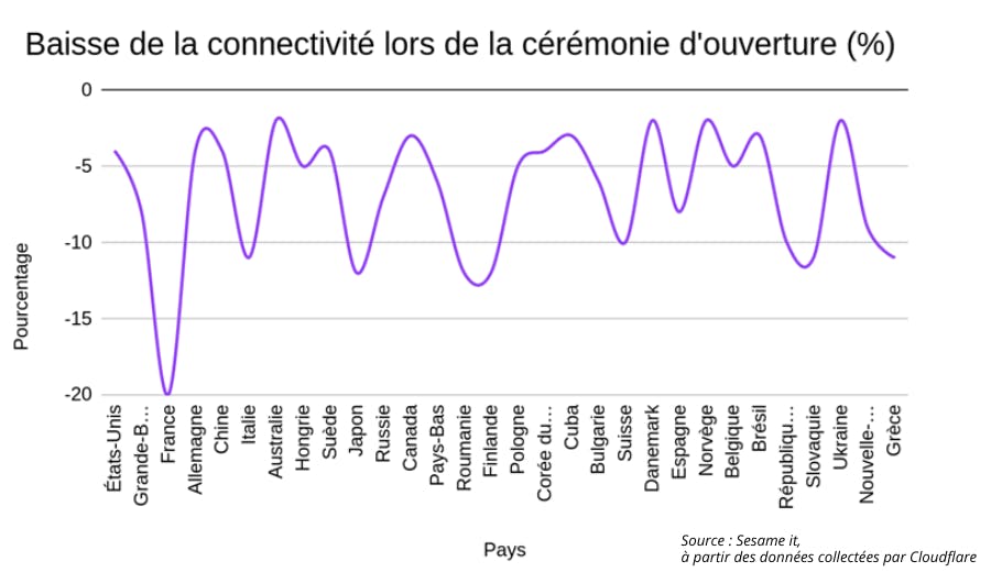 Le principal impact numérique de cette cérémonie hors norme a été une baisse de connectivité mondialisée, conséquence directe de la la forte hausse simultanée de la demande en streaming : - 4% aux Etats-Unis à 20h15 UTC, - 8% en Grande-Bretagne, - 12% au Japon, avec un pic de -20% en France à 21h15 UTC (Cloudflare). Les baisses de trafic les plus considérables hors États membres de l’OCDE se sont situées en Ouzbékistan (-12 %), Argentine (-13 %) et en Mongolie (-20 %).