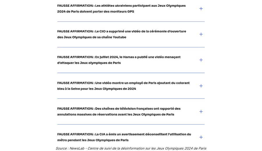 En parallèle du champ cybernétique et des systèmes d’information critiques, s’est jouée une autre bataille informationnelle sur les réseaux sociaux. Selon NewsGuard, 34 faux récits ont été recensés depuis l'ouverture des Jeux, propagés dans 16 langues via 74 sites d'information. Pour plusieurs d’entre eux, des connexions directes ou indirectes ont pu être retracées avec des réseaux de désinformation du Kremlin déjà en service lors des élections européennes et législatives françaises*. 11 de ces sites appartiennent par exemple au réseau Prava, notoirement connu pour sa propagande pro-russe.