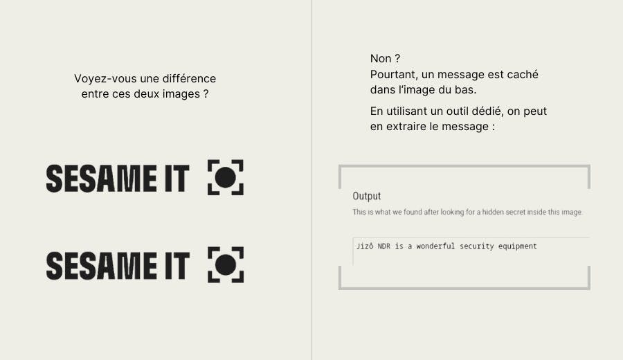 Il est très difficile de déceler la présence d’une information cachée dans un média. Cependant, si ce média a déjà été utilisé dans le passé dans une attaque, il devient alors facile de le détecter grâce aux modules de Jizô AI, en se basant sur sa signature.