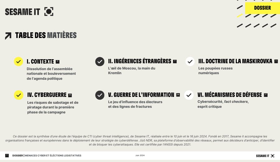 Durant les 15 prochains jours, les unités cyber russes pourraient envisager de faire des élections législatives anticipées leur principal terrain de jeu pour déstabiliser la France. C’est ce qui ressort de l’étude menée entre le 10 et le 16 juin 2024 par Hoshi, l’équipe de Cyber Threat Intelligence de Sesame it.